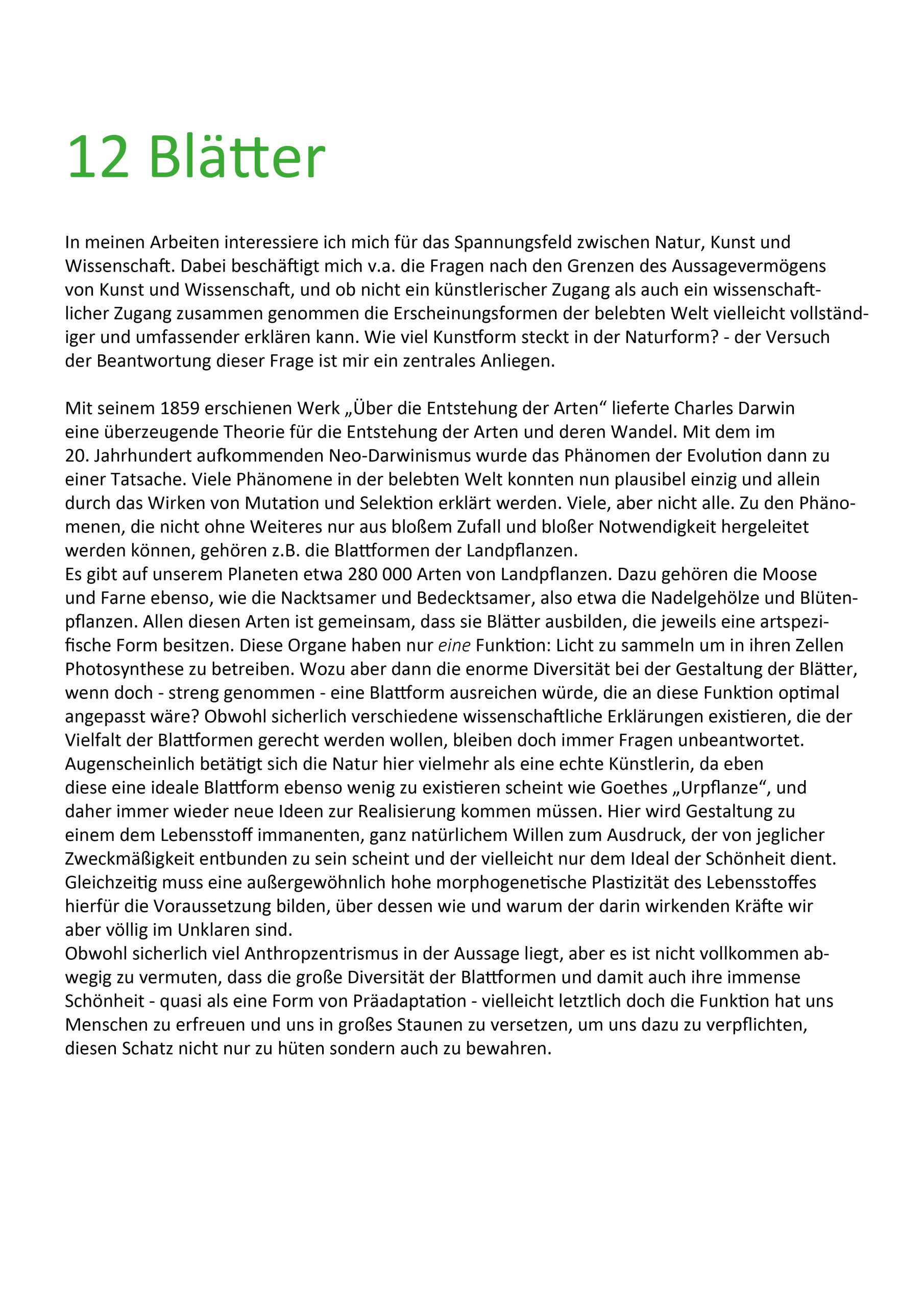 12 Blätter Aesculus, Acrylstifte auf Papier, 29,7 x 42 cm, 2023Prenanthes, Acrylstifte auf Papier, 29,7 x 42 cm, 2023Ipomea, Acrylstifte auf Papier, 29,7 x 42 cm, 2023Sanguinaria, Acrylstifte auf Papier, 29,7 x 42 cm, 2023Acer, Acrylstifte auf Papier, 29,7 x 42 cm, 2023Syneilesis, Acrylstifte auf Papier, 29,7 x 42 cm, 2023Macleaya, Acrylstifte auf Papier, 29,7 x 42 cm, 2023Monstera, Acrylstifte auf Papier, 29,7 x 42 cm, 2023Quercus, Acrylstifte auf Papier, 29,7 x 42 cm, 2023Philodendron, Acrylstifte auf Papier, 29,7 x 42 cm, 2023Sassafras, Acrylstifte auf Papier, 29,7 x 42 cm, 2023Philodendron, Acrylstifte auf Papier, 29,7 x 42 cm, 2023